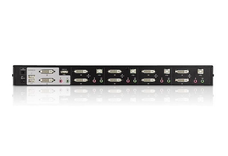 • 4-port DVI Dual View KVMP switch with USB 2.0 support and 2.1 channel surround sound audio