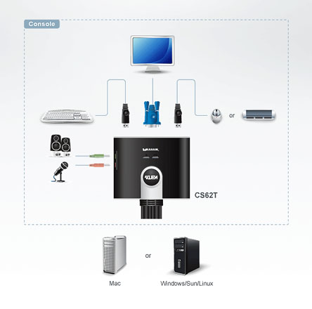 Featuring an unbeatable combination of USB peripheral sharing, USB file management, audio support for multimedia and user-friendly operation, the CS62T offers the utmost in desktop KVM switching functionality.