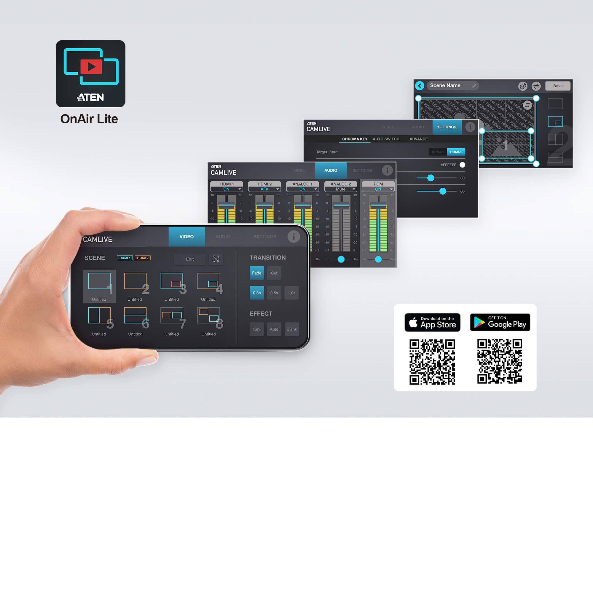 The CAMLIVE™ PRO is designed to easily capture and mix the two connected 4K video sources in FHD format for livestream purpose with outstanding video effects and remarkable image quality. It supports easy switch between multiple connected sources and combine them for a rich information delivery in steaming. In addition, it automatically converts the sources to cleanlooking USB video format in 720P or 1080P, which is sent to your laptop/smartphone via USB.The CAMLIVE™ PRO provides an intuitive ATEN OnAir Lite App. This App places everything you need to customize your video stream right at your fingertips. You can make it look like you are anywhere by changing the background for eye-popping effects. With just the CAMLIVE™ PRO, companion app, and your laptop / smartphone, you have all the devices you need to present engaging livestreaming that will rival the most advanced streamers on social media and provides an easy-to-use solution.