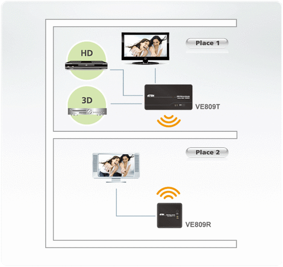 The VE809 HDMI Wireless Extender extends your HDMI display up to 30 m* from the HDMI source using wireless technology. Easily connect two HDMI devices to an HDTV wirelessly with crystal clear image quality capable of streaming Full 1080p with 5.1 channel digital audio and 3D technology. The IR remote control allows you to switch between HDMI source devices from the receiver side, remotely; and allows you to watch a local and wirelessly connected HDTV- simultaneously. The VE809 consists of a wireless audio/ video transmitter and receiver. Consolidate your HDMI electronics and use the VE809 as a wireless 2-port HDMI switch to connect remote devices such as Blu-ray players and HD Cable boxes to design your own custom wireless entertainment space.