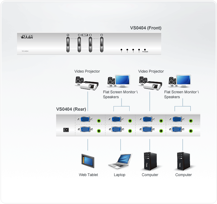 The VS0404 Video Matrix Switch allows video and audio from 4 computers to be routed to 4 monitors, projectors and speakers. Ideal for presentations and applications where information from multiple computers is being delivered to multiple destinations.