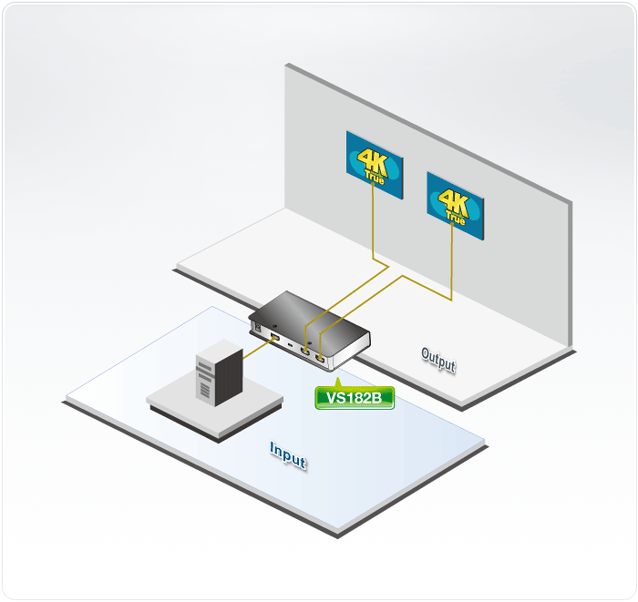 The VS182B True 4K HDMI Splitter is HDMI 2.0 compliant, 4K at 60Hz (4:4:4), and supports multiple streaming audio, making it effective for use with all HDMI displays in home theater applications, as well as in corporate, educational and commercial settings.