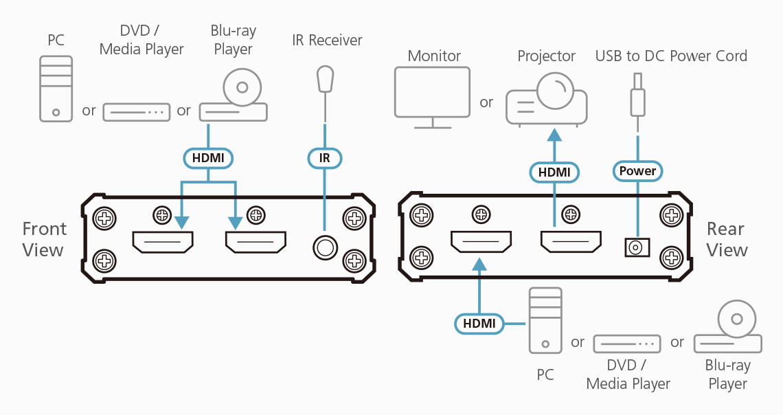 - Switching between HDMI input sources via front panel pushbuttons and IR remote control