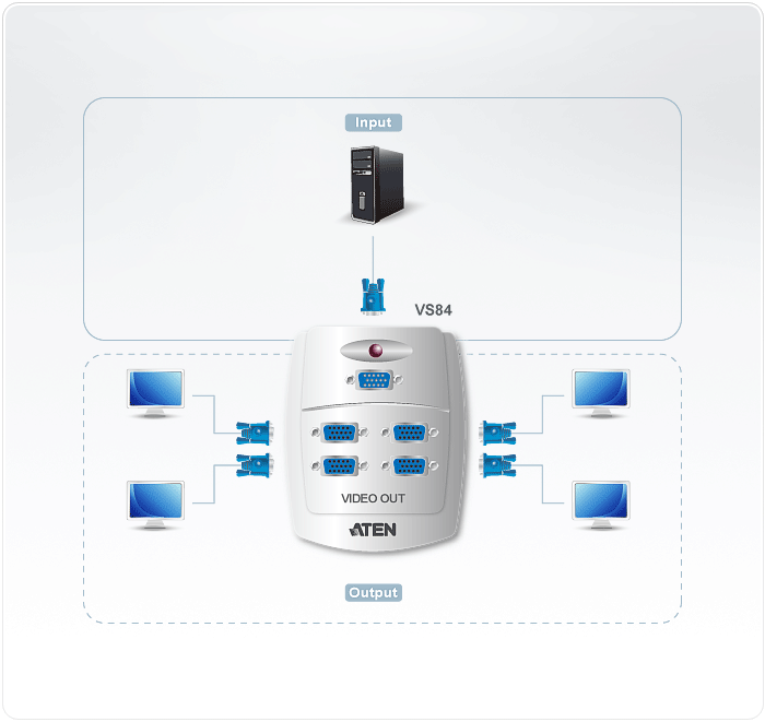 The VS84 Video Splitter duplicates the video signal from an input source (i.e. a computer) and route it to up to 4 display devices (monitors, projectors, etc.). However, they go beyond being merely duplicators, in that they also enhance the video signals over distances up to 30 meters. Furthermore, they can be cascaded three levels to additional ATEN video splitters to support many numerous display devices. And they mount inconspicuously on the wall or out of sight.