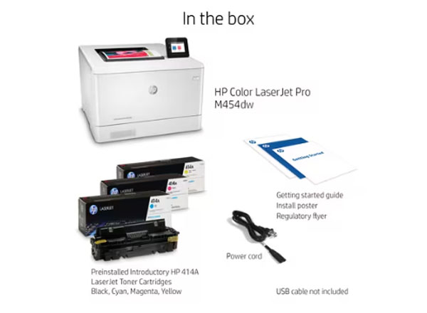 What’s in the box: HP Color LaserJet Pro M454dw; 4 preinstalled Introductory HP LaserJet Toner cartridges (Black, Cyan, Magenta, Yellow: ~1200 pages); In-box documentation (Getting Started Guide, Install Poster), regulatory flyer, warranty card (China, Mexico); Internet connection is required to set up the printer. HP printer software is available at http://www.hp.com/support; Power cord; USB cable.