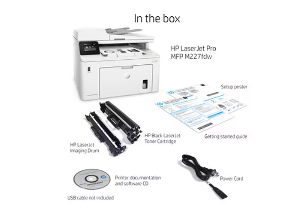 HP LaserJet Pro MFP M227fdw; HP Black LaserJet Toner Cartridge ~1600 pages; HP LaserJet Imaging Drum ~23,000 pages; Power cord; Getting started guide; Set up poster; Support flyer; Printer documentation and software on CD-ROM